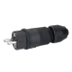 Made in Germany, 2-Komponenten Stecker aus extrem belastbaren Hochleistungs-Kunststoff mit garantiert höchster Festigkeit für erschwerte Bedingungen, mit zentraler Leitungseinführung, optimale Abdichtung durch außenliegende, schraubenlose Kabelverschraubung mit Zugentlastung und Knickschutztülle, doppeltem Erdungssystem und Hammerschlagzeichen T, medienbeständig gegen Zement, Teer und Mineralöle, UV-beständig, temperaturbeständig -40° bis +80°C, IK08, spritzwassergeschützt IP54, für Leitungen bis H07RN-F 3x2,5mm², VDE