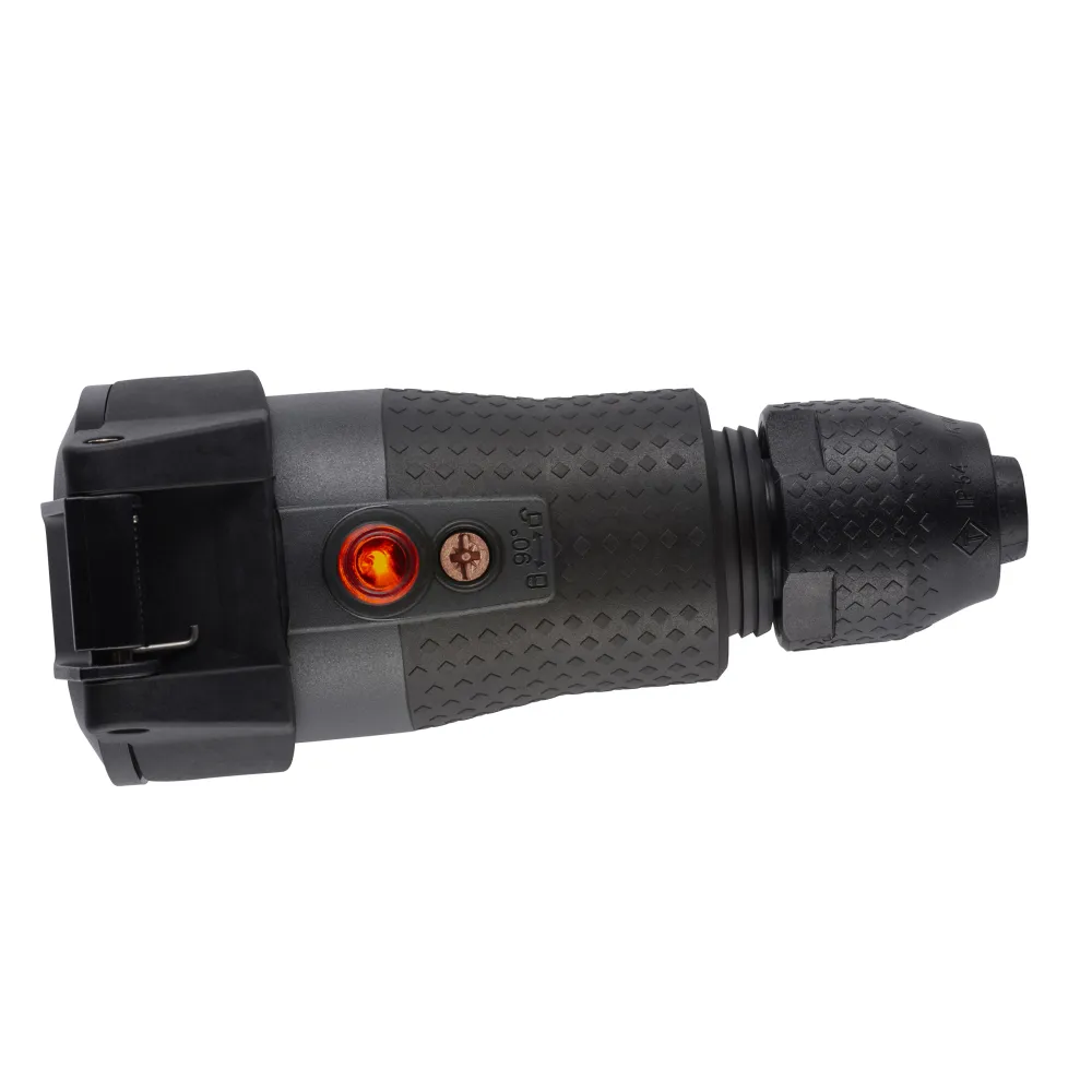 Made in Germany, 2-Komponenten Stecker aus extrem belastbaren Hochleistungs-Kunststoff mit garantiert höchster Festigkeit für erschwerte Bedingungen, mit zentraler Leitungseinführung, optimale Abdichtung durch außenliegende, schraubenlose Kabelverschraubung mit Zugentlastung und Knickschutztülle, doppeltem Erdungssystem und Hammerschlagzeichen T, medienbeständig gegen Zement, Teer und Mineralöle, optische, integrierte Spannungsanzeige,UV-beständig, temperaturbeständig -40 bis +80C, IK08, spritzwassergeschützt IP54, für Leitungen bis H07RN-F 3x2,5mm≤, VDE