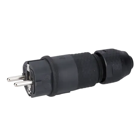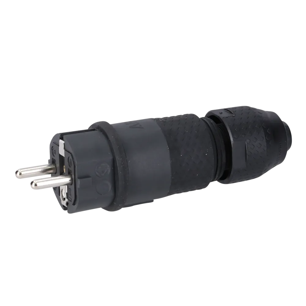 Made in Germany, 2-Komponenten Stecker aus extrem belastbaren Hochleistungs-Kunststoff mit garantiert höchster Festigkeit für erschwerte Bedingungen, mit zentraler Leitungseinführung, optimale Abdichtung durch außenliegende, schraubenlose Kabelverschraubung mit Zugentlastung und Knickschutztülle, doppeltem Erdungssystem und Hammerschlagzeichen T, medienbeständig gegen Zement, Teer und Mineralöle, UV-beständig, temperaturbeständig -40 bis +80C, IK08, spritzwassergeschützt IP54, für Leitungen bis H07RN-F 3x2,5mm≤, VDE
