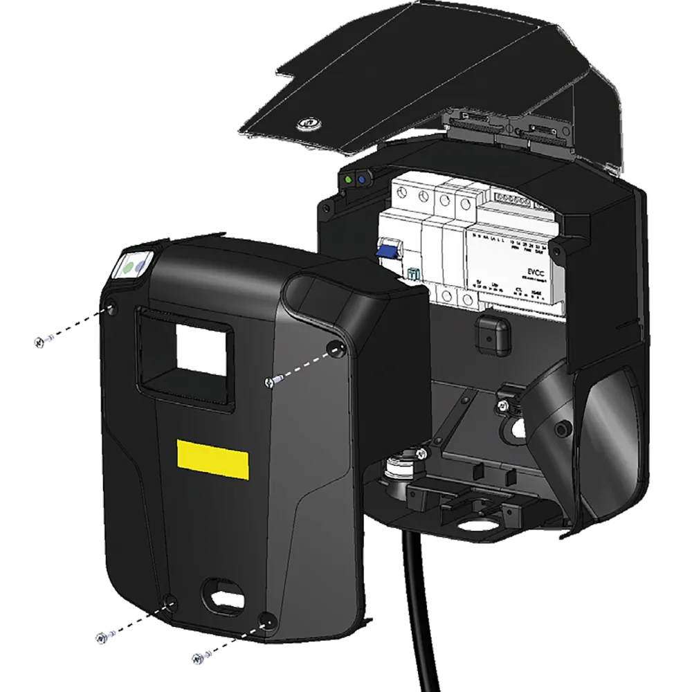 für eine effiziente Ladung von Elektrofahrzeugen im Innen- und Außenbereich, zur Wandbefestigung mit abschließbarer Blende, DC-Fehlerstromerkennung, Netzanschluss max. 5x6mm², Nennspannung 230/400V, Betriebs- und Ladeüberwachung gemäß IEC 61851-1, BUS-Schnittstelle RS485 für Leistungsverteiler, Temperaturbereich -30°C bis +50°C, Schutzklasse 1, Schutzart IP54, Anschlusstechnik gemäß IEC 62196-2, Montageanleitung, Bohrschablone, Montage-Set und 2 Schlüssel