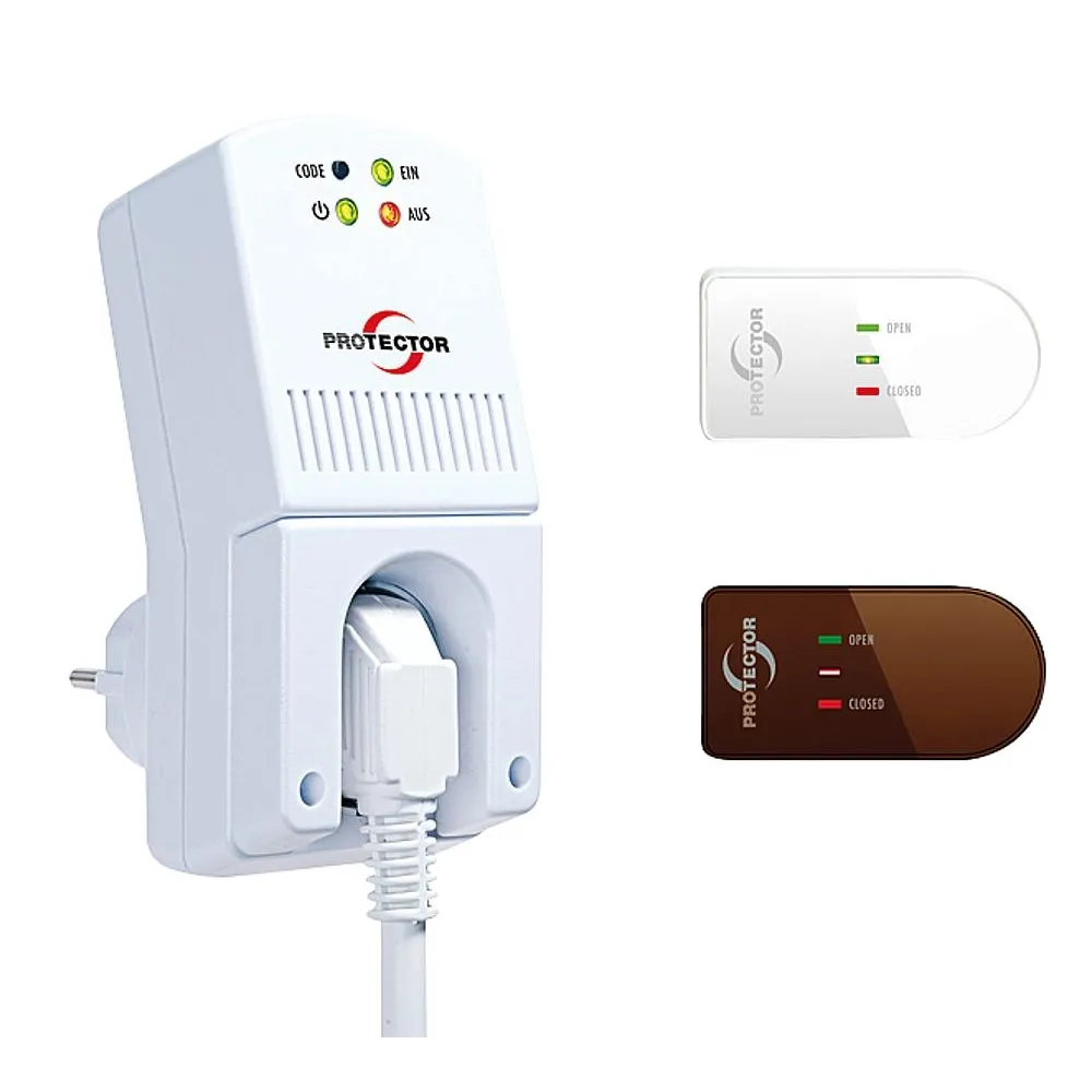 Stecker-Steuerempfangsgerät mit Umstecksicherung mit Hauptschalterfunktion und Testtaster, erweiterbar bis auf 6 Fensterkontakte Funk-Mini-Fensterkontakt mit LED-Statusanzeige, H30xB60xT17mm, inklusive Knopfzelle 1x CR2477 und braunem Wechselgehäuse, Funkfrequenz 434 MHz, Reichweite ca. 50m, DIBT-Zulassung
