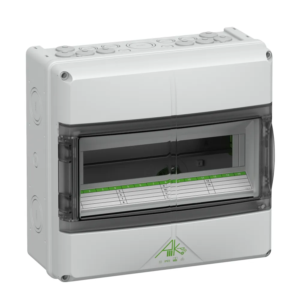 schutzisoliert, aus Polycarbonat, Schlagfestigkeit IK08, seitlich anreihbar, Montage innen über Schlüsselloch-Befestigung mit zusätzlich von außen montierbaren Befestigungslaschen, vorgestanzte, metrische Einführungen oben, unten und seitlich sowie elastische Einführungen oben, großzügiger Verdrahtungsraum, Verdrahtung unter Hutschiene möglich, schraubenlose N/PE-Klemmschiene 1,5-4mm≤ mit schraubbare Klemmstellen 2,5-16mm≤, Hutschienen 35mm für Reiheneinbaugeräte, Abstand 125mm und 150mm wechselbar und in 3 Tiefen montierbar, Haube mit Befestigungsschrauben, innenliegendes Klappfenster für Rechts- oder Linksanschlag montierbar und Griff mit Schnappverschluss, mit Air-Belüftungssystem zur Vermeidung von Kondenswasser im Innenraum, amoniakbeständig und resistent gegen Stallluft, halogenfrei, In = 125A, IP65, VDE/DLG