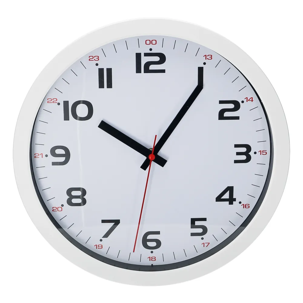 Gehäuse Kunststoff, Abdeckung Kunststoffglas, Geräuscharmes Sweep-Uhrwerk, Zifferblatt weiß mit 12- und 24-Stunden Markierung, Batterie 1 Mignon