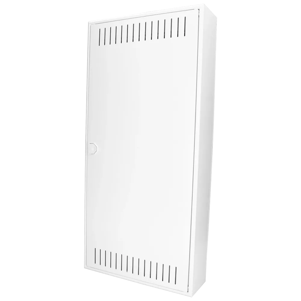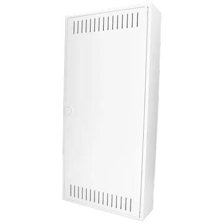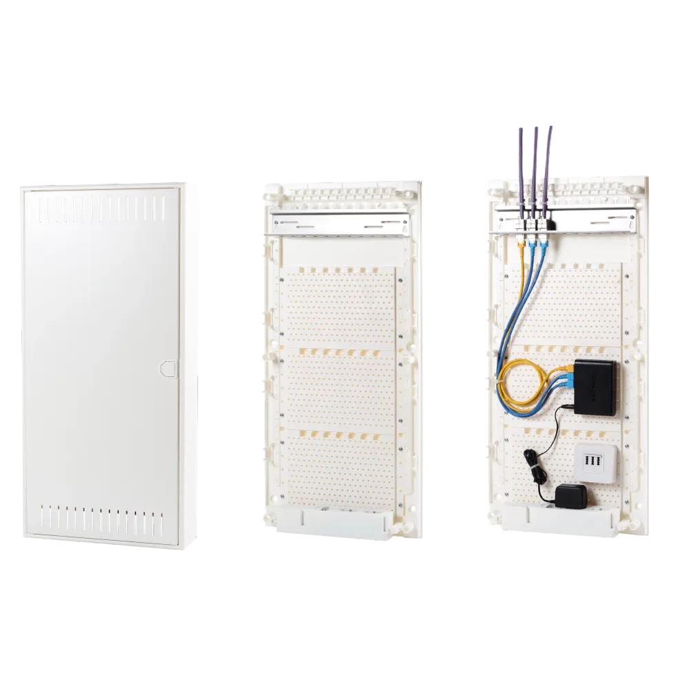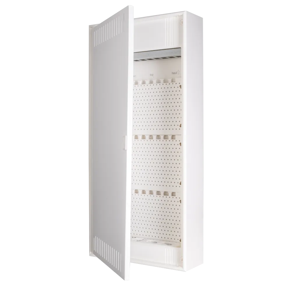 nach DIN 18015-1 bis 18015-4, zur Aufputzmontage (inklusive Montageplatten), für Geräte bis 63A, inklusive Keystone Patchpanel für 12 Module, Kunststofftrageplatte für Hardware Komponenten und einer 3-fach Steckdosenleiste, plombierbar, Blendrahmen mit Stahlblechtür rechts oder links anschlagbar, IP30, Bemessungsspannung 400V, Glühdrahtfestigkeit 750°C, Farbe weiß