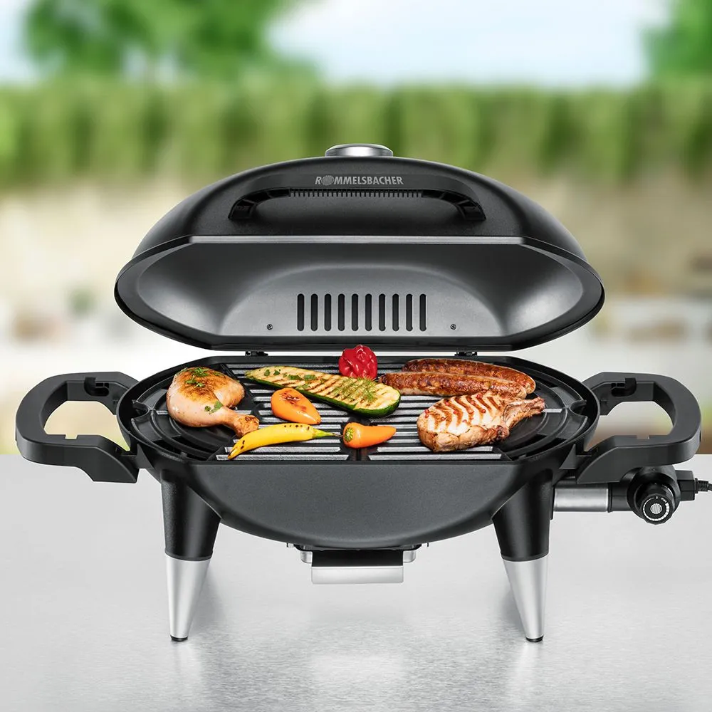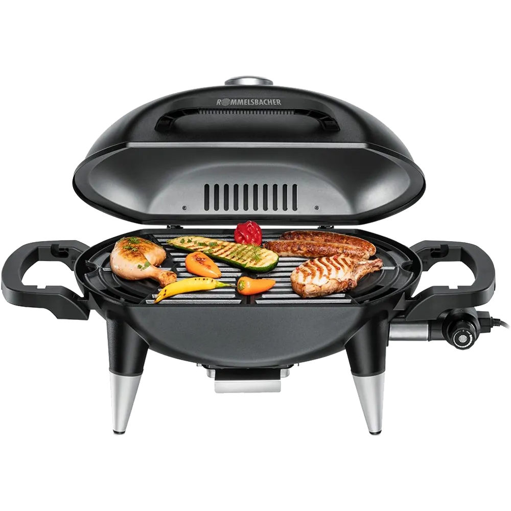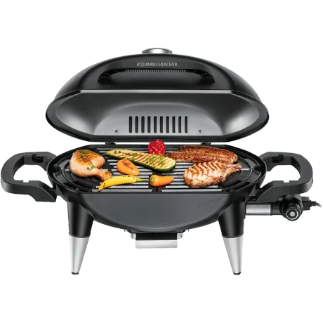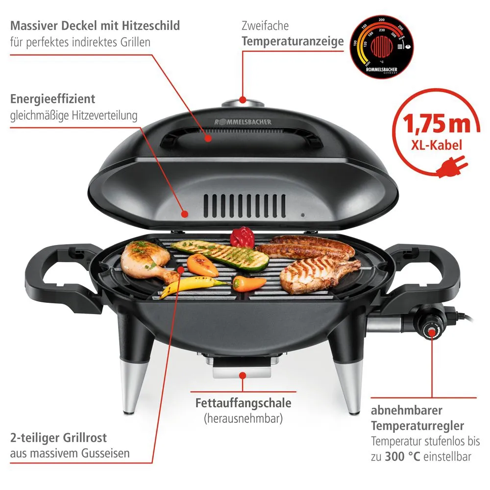 Gehäuse und Scharnierdeckel aus massivem Stahlblech, hitzebeständige und robuste Lackierung, hochwertiger 2-teiliger Grillrost aus massivem Gusseisen, geriffelte Grillfläche für typisches Grillmuster, Scharnierdeckel mit wärmeisolierendem Alu-Hitzeschutzschild Temperaturanzeige, leistungsstarkes Heizelement aus Edelstahl für schnelles Aufheizen, Temperatur stufenlos bis zu 300°C einstellbar, auch für Niedertemperatur-Garen geeignet, abnehmbarer Temperaturregler, extra langes Kabel (1,75 m), Kontrolllampe, herausnehmbare Fettauffangschale, B770xH430x370mm