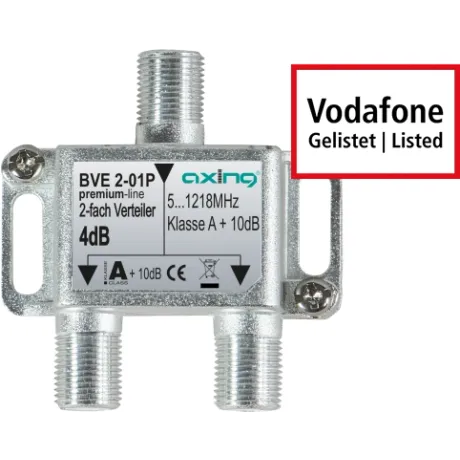 F-Technik, Multimedia-tauglich, Kontakte vergoldet, 5-1218MHz, Ein- und Ausgänge brummentstört, hohe Rückflussdämpfung, Gehäuse Druckguss mit Erdklemme und separatem Montagesockel, Gehäuse 2-fach 67x55x30mm, 3-fach 89x55x30mm, 4-fach 89x55x30mm, 6-fach 142x64x32mm, 8-fach 142x64x32mm, Klasse A - Schirmungsmaß >90dB, Vodafone Kabel Deutschland gelistet