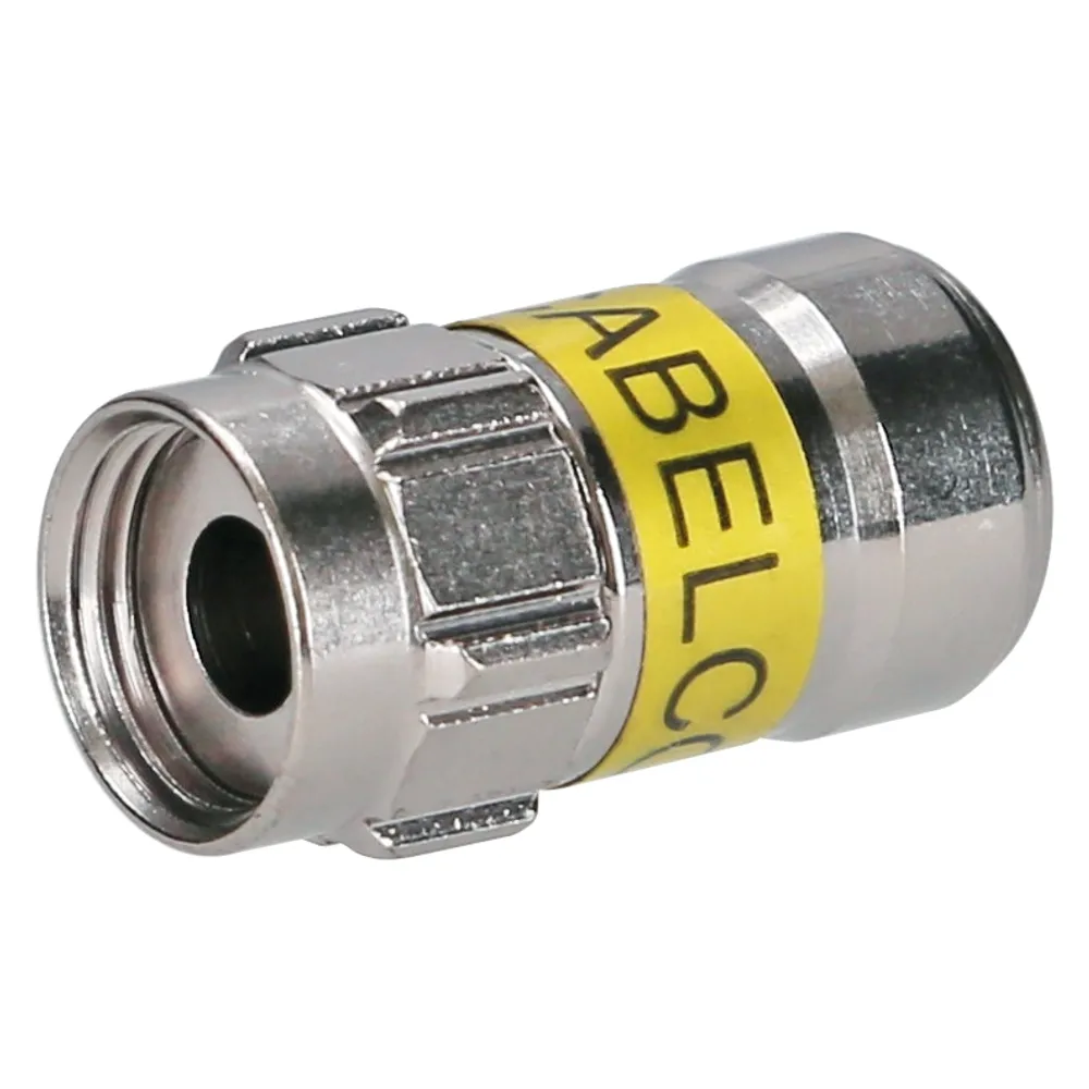 F-Technik, Kompressionsvorgang durch Festziehen der Überwurfmutter ohne Werkzeug, einfache und schnelle Montage durch Aufschieben des Steckers, keine Verformung des Kabeldielektrikum, mit NITIN 6-Beschichtung, 0-3000MHz, Impedanz 75Ω, Schirmungsmaß 30-862MHz 110dB, 862-3000MHz 90dB