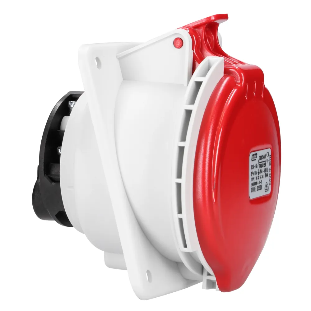 zum Einbau in Wandverteiler, Gehäuse Thermoplast, Schlagfestigkeit IK08, halogenfrei, mit selbstschließendem Deckel, Öffnungswinkel 180°, Gummi-Flanschdichtung, 4-Loch-Flansch-Befestigung und Schraubklemmen, Flansch 96x80mm, Einbautiefe 51mm, Neigung 17°, spritzwassergeschützt IP44, 240/415V, 3-polig + N + PE, 6h