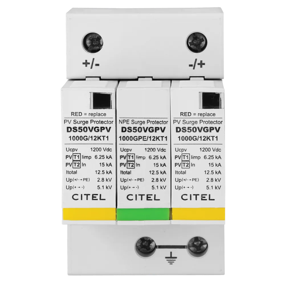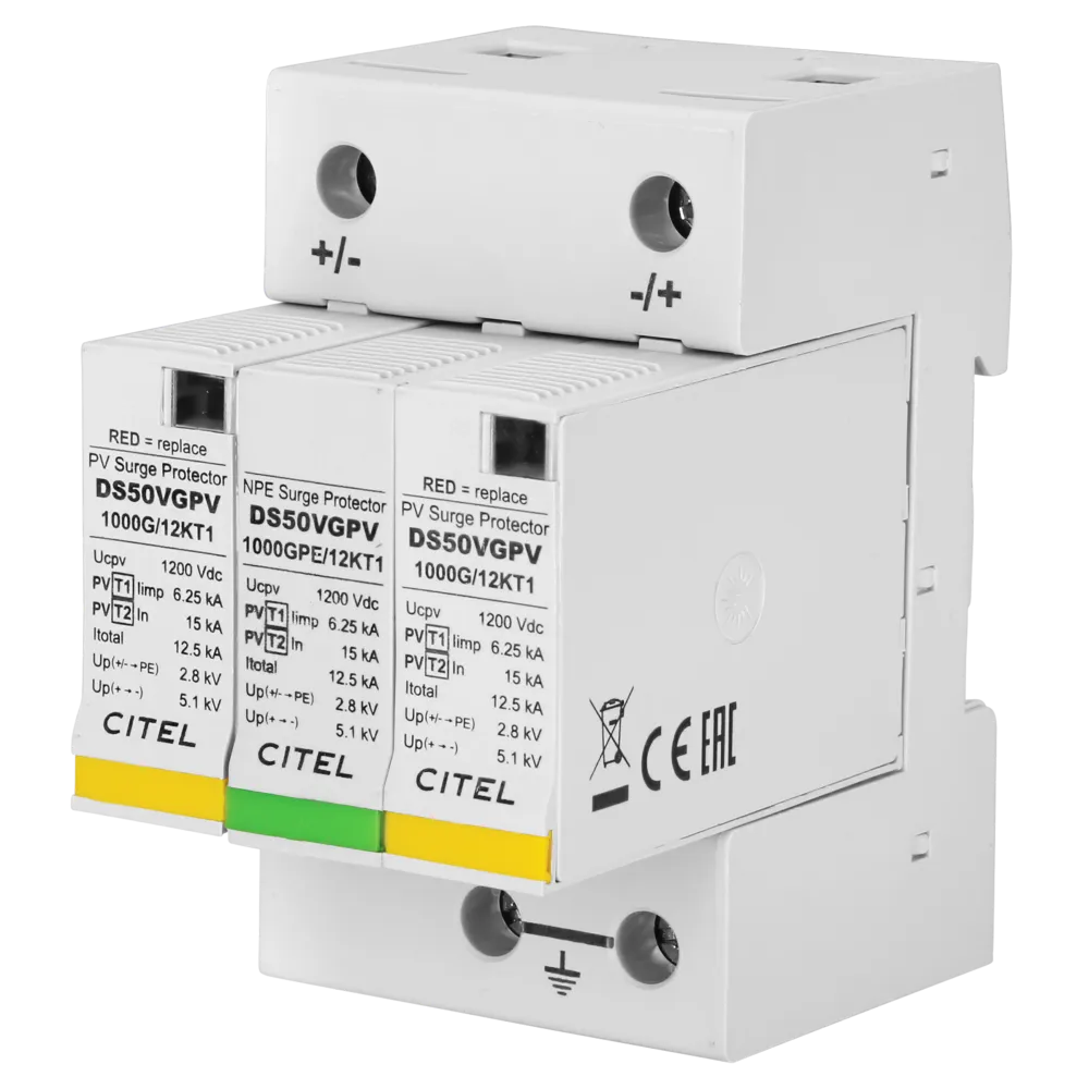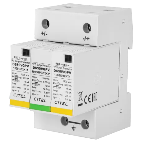 Kombischutz für die Ableitung von Blitzströmen und Schutz vor Spannungsspitzen nach Klasse I/Typ 1 und Klasse II/Typ 2, für Photovoltaikanwendungen, Schutzmodule mit Funktions- und Defektanzeige, einzeln austauschbar, Fernsignalisierung, max. Ableitstrom 40kA, Nennableitstrom 15kA, höchste Dauerspannung 1,2kV/DC, Ansprechzeit < 20ns, VG-Technology, folge- und leckstromfrei, Montage auf Hutschiene 35mm, mit Schraubanschlüssen für Leiter 2,5-25mm², entsprechend der Normen IEC 61643-11 und EN 61643-11, Zugelassen nach UL 1449 ed.3, Betriebstemperatur -40° bis +85°C, 3 TE, 2-polig
