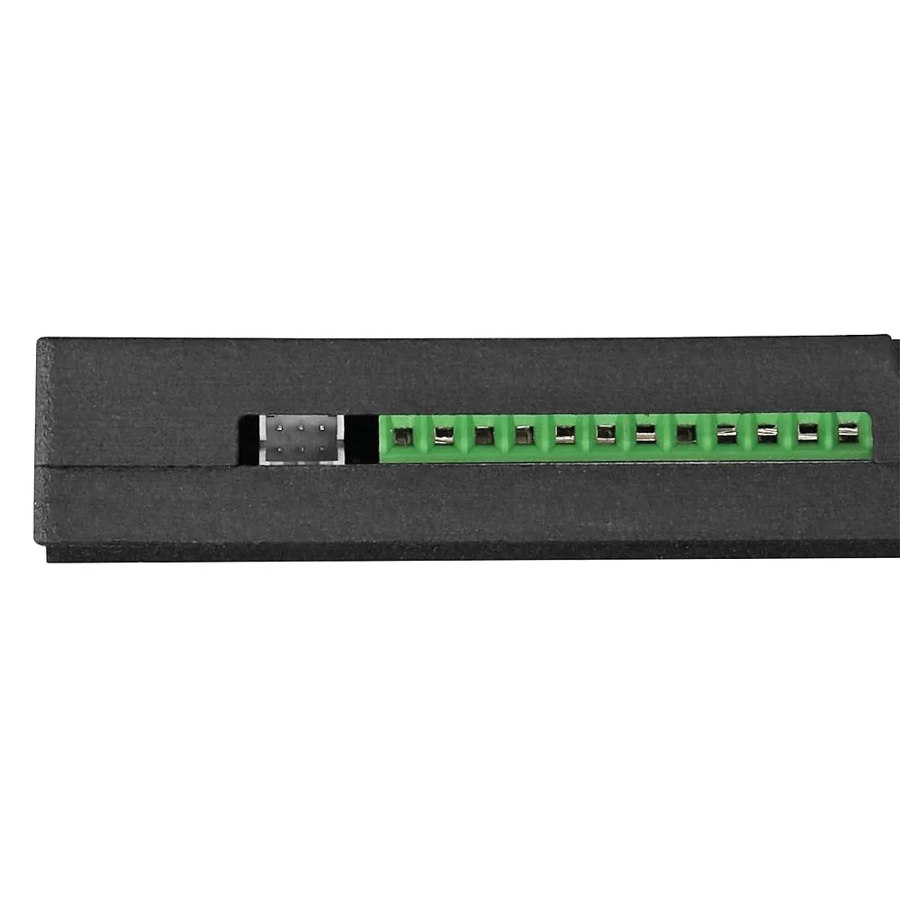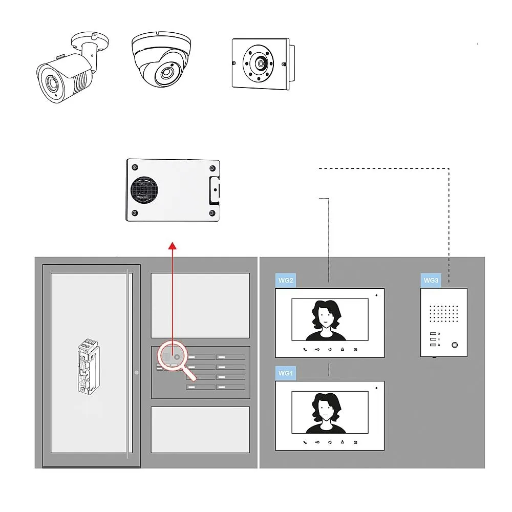 2-Draht-Technik, Audio, zum Einbau in vorhandene Türstation oder Briefkästen, Befestigung über Klebepad oder bauseits vorhandener Vorrichtung, mit Anschluss von bis zu 8 Klingeltaster, integriertem Lautsprecher und Mikrofon, zur Entkopplung ca. 25cm von Lautsprecher entfernt montierbar, Lautstärke über Potentiometer einstellbar, potentialfreier Türöffnerkontakt für externe Spannungsversorgung 30V DC/12V AC-1A mit einstellbarer Schaltzeit 5-300 Sekunden und Status-LED für Busspannung, 120x80x21mm, IP33, mit Anschluss einer externen Kamera Villa EK, C02 E oder C03 E erweiterbar zur Video-Anlage