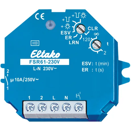 zum Einbau in Abzweigdosen und AP-Montage, einstellbarer Funktion Stromstoßschalter oder Relais, Rückfallverzögerung 2-120 Minuten mit Ausschaltvorwarnung und Taster-Dauerlicht, bis zu 35 Funktaster können eingelernt werden, Schaltkontakt 1 Schließer 230V/10A potentialfrei, Gehäuse 45x55x33mm, mit zusätzlichem Tastereingang 230V
