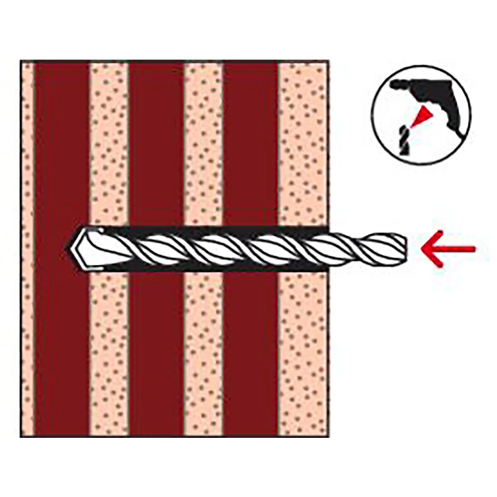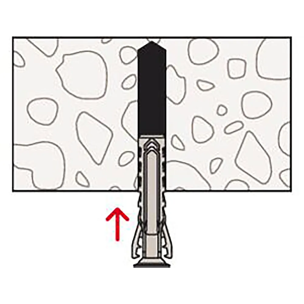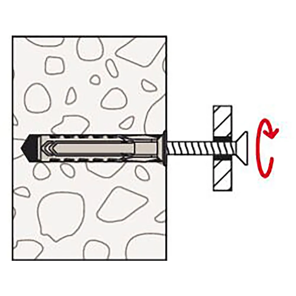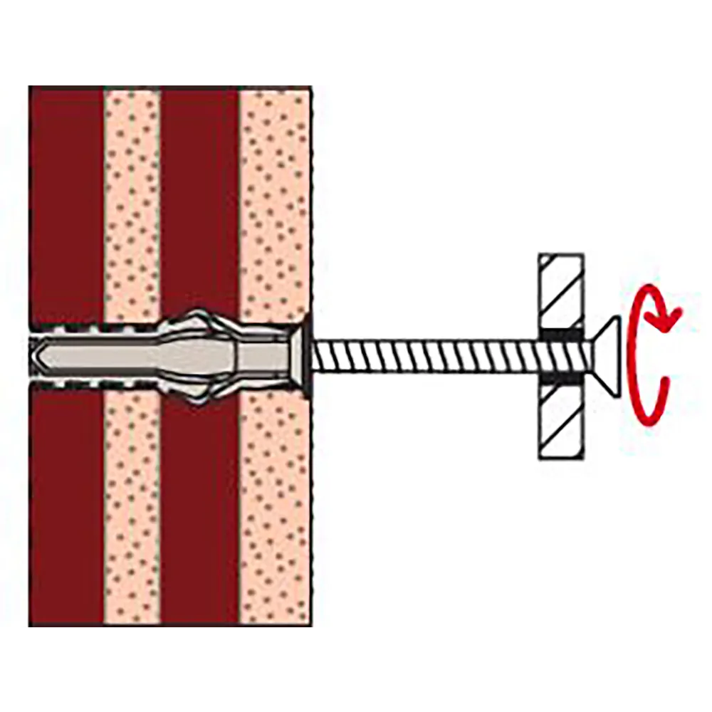 Nylon, mit 4-fach-Spreizung welche für optimale Krafteinleitung in den Baustoff sorgt und garantiert hohe Haltewerte in Voll- und Lochbaustoffen wie Beton, Vollziegel, Kalksandvollstein, Porenbeton, Hochlochziegel, Kalksandlochstein, Hohlbock aus Leichtbeton, Vollstein aus Leichtbeton, Naturstein, Hohldecken aus Ziegel und Beton und Vollgips-Platten, spezielle Fixierflügel sorgen für eine Vorfixierung der Schraube, wodurch beim Setzvorgang beide Hände des Anwenders frei sind, der Dübelrand verhindert Tieferrutschen in das Bohrloch, spürbares Festziehmoment verhindert Überdrehen der Schraube, montieren des Dübels mit geringem Kraftaufwand möglich