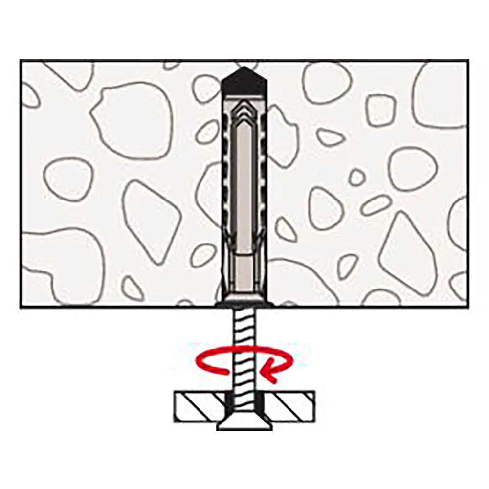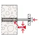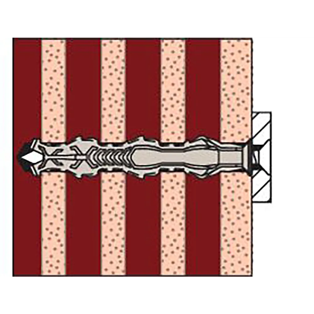 Nylon, mit 4-fach-Spreizung welche für optimale Krafteinleitung in den Baustoff sorgt und garantiert hohe Haltewerte in Voll- und Lochbaustoffen wie Beton, Vollziegel, Kalksandvollstein, Porenbeton, Hochlochziegel, Kalksandlochstein, Hohlbock aus Leichtbeton, Vollstein aus Leichtbeton, Naturstein, Hohldecken aus Ziegel und Beton und Vollgips-Platten, spezielle Fixierflügel sorgen für eine Vorfixierung der Schraube, wodurch beim Setzvorgang beide Hände des Anwenders frei sind, der Dübelrand verhindert Tieferrutschen in das Bohrloch, spürbares Festziehmoment verhindert Überdrehen der Schraube, montieren des Dübels mit geringem Kraftaufwand möglich