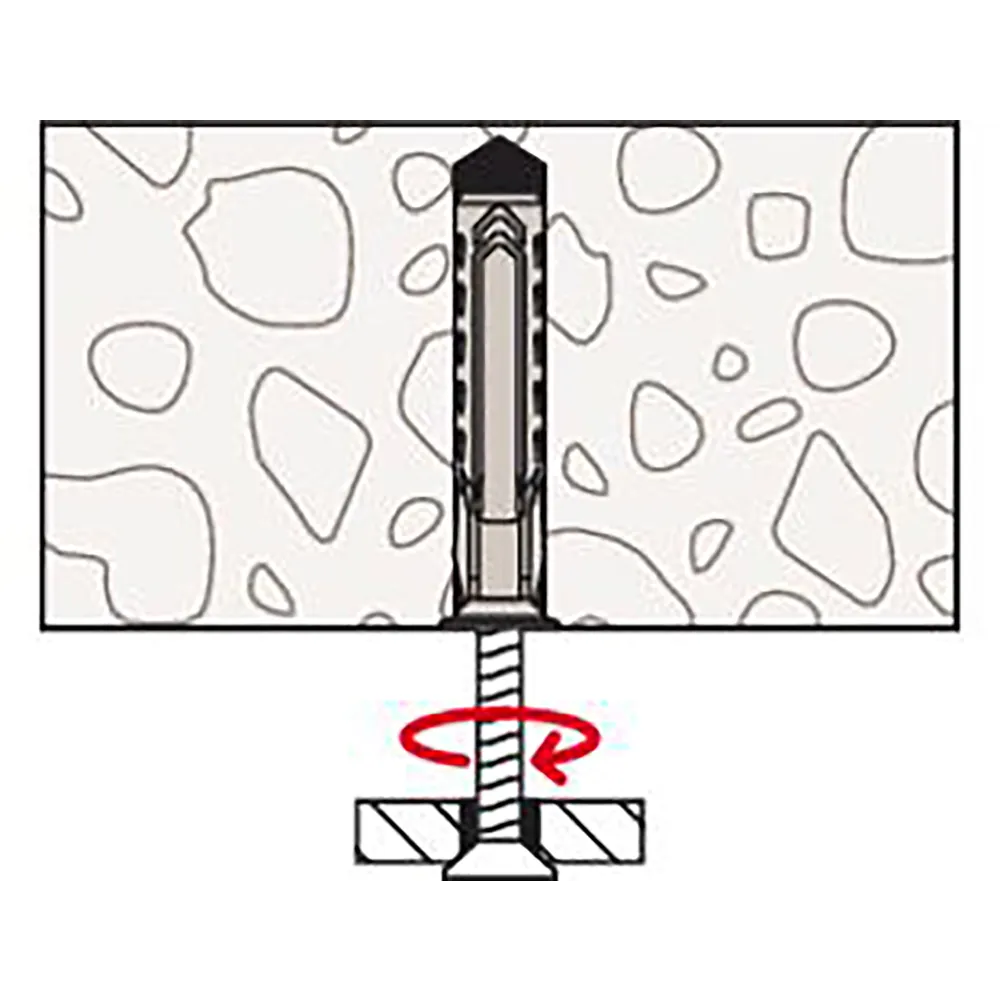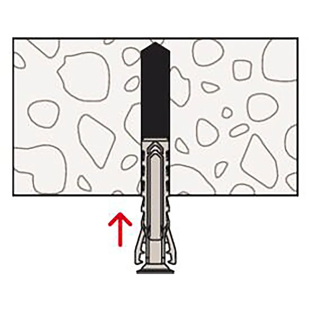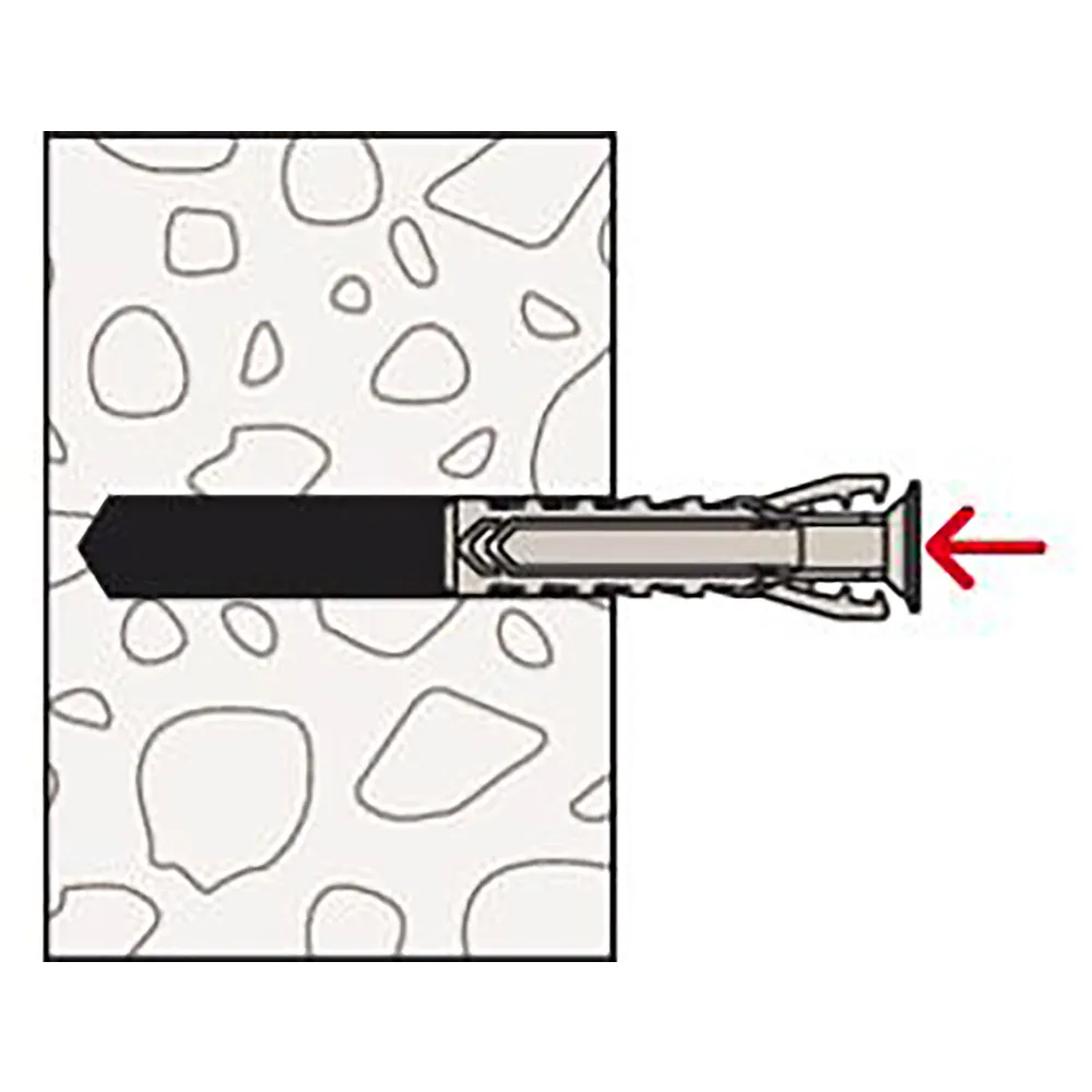 Nylon, mit 4-fach-Spreizung welche für optimale Krafteinleitung in den Baustoff sorgt und garantiert hohe Haltewerte in Voll- und Lochbaustoffen wie Beton, Vollziegel, Kalksandvollstein, Porenbeton, Hochlochziegel, Kalksandlochstein, Hohlbock aus Leichtbeton, Vollstein aus Leichtbeton, Naturstein, Hohldecken aus Ziegel und Beton und Vollgips-Platten, spezielle Fixierflügel sorgen für eine Vorfixierung der Schraube, wodurch beim Setzvorgang beide Hände des Anwenders frei sind, der Dübelrand verhindert Tieferrutschen in das Bohrloch, spürbares Festziehmoment verhindert Überdrehen der Schraube, montieren des Dübels mit geringem Kraftaufwand möglich