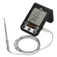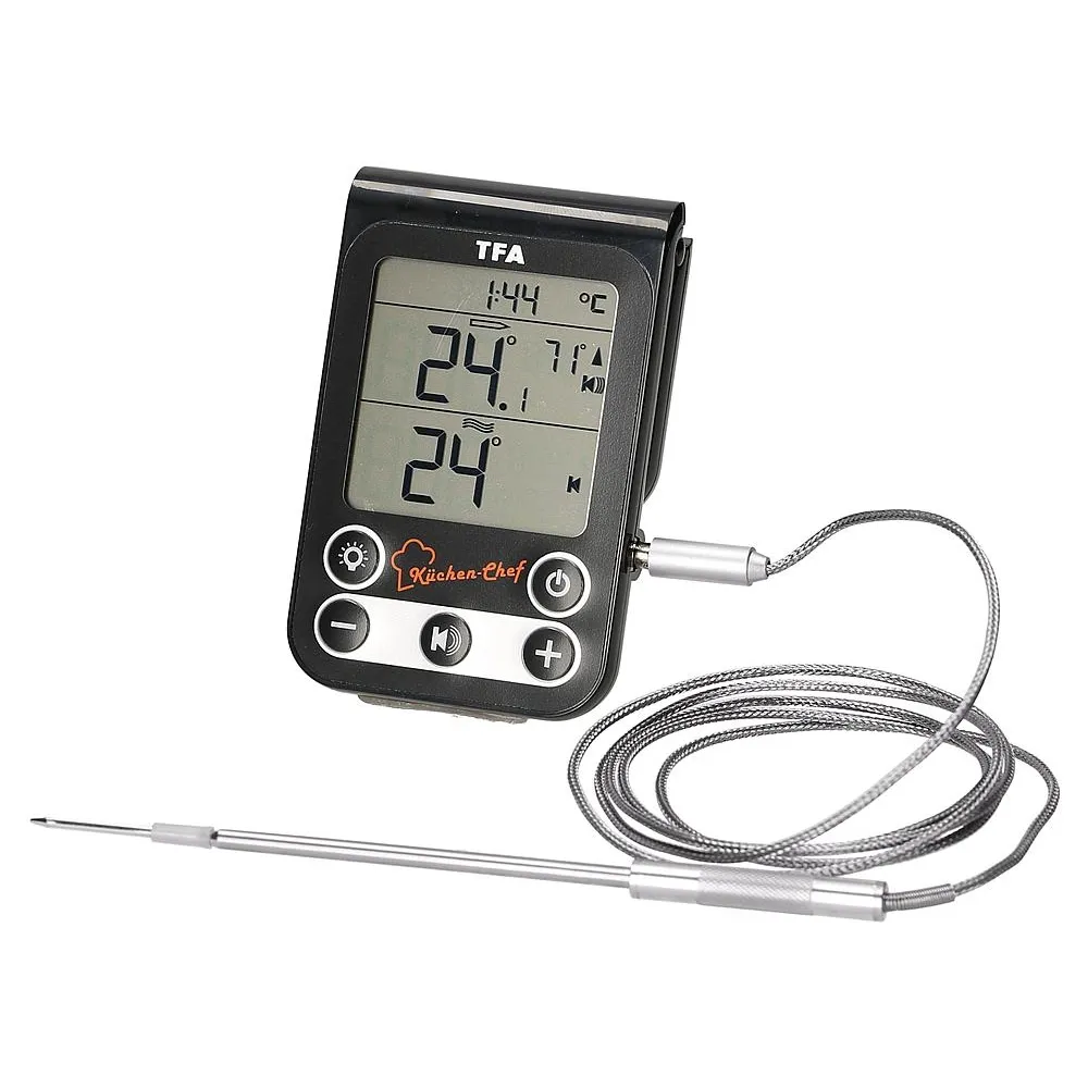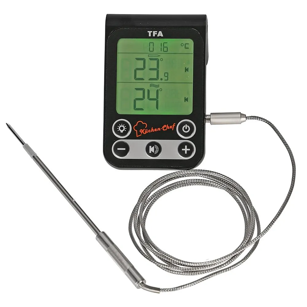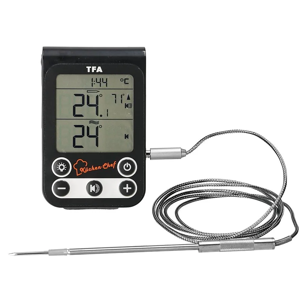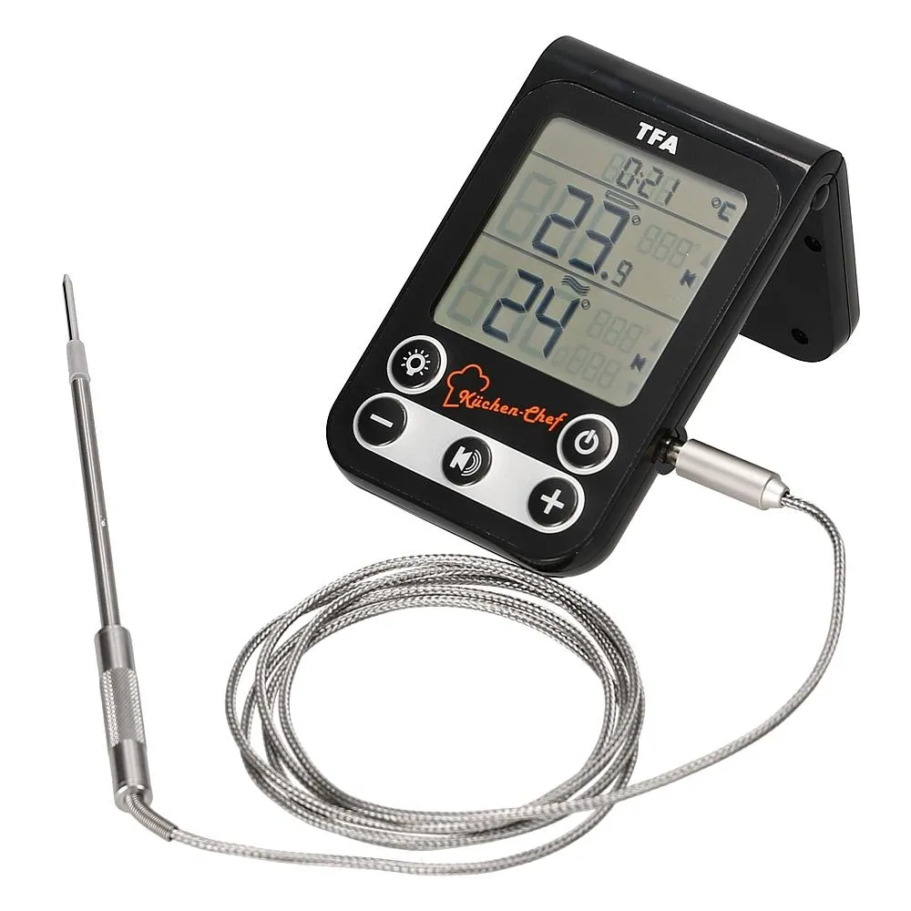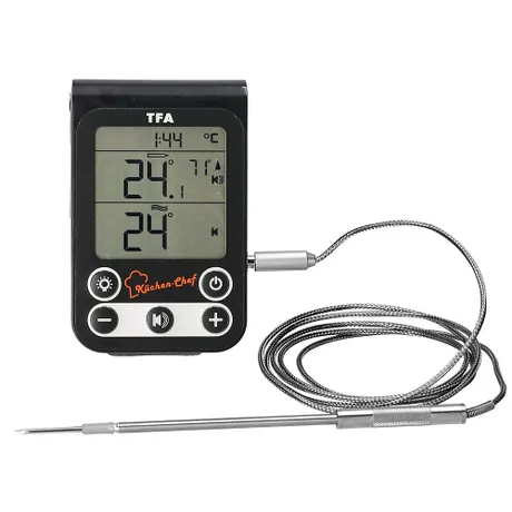 zur optimalen Zubereitung von Fleisch und Geflügel durch gleichzeitige Überwachung der Kerntemperatur und der Ofentemperatur mit Temperaturober- und Untergrenze, für Backofen und Grill, auch zum Garen bei Niedrigtemperatur, individuelle Temperaturvorgaben einstellbar, optischer und akustischer Alarm bei Erreichen der Kerntemperatur und wenn die Ofentemperatur außerhalb der vorgegebenen Grenzwerte liegt, hochwertiger Edelstahl-Einstichfühler, Lämge 115mm, mit extradünner Spitze und aufgerautem Griff zum sicheren Halt kann während des ganzen Bratvorgangs im Backofen oder Grill bleiben, das hitzebeständige Kabel 1,2m mit Knickschutz wird aus dem Garraum herausgeführt, Bedienelement mit LCD-Display grün beleuchtet, Befestigungsmagnet und Ständer, Messbereich -20°C bis +300°C, B60xH100xT20mm, Batteriebetrieb