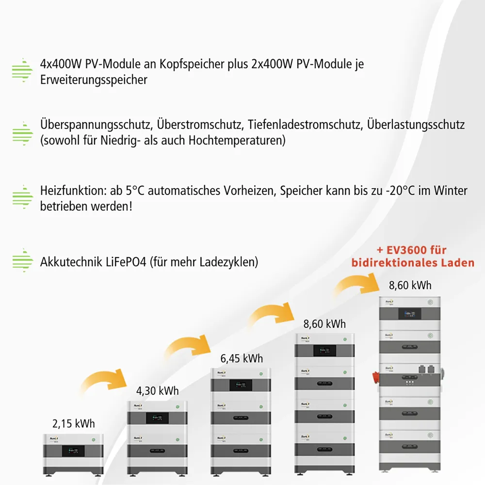 modulare Bauweise, perfekte Ergänzung zum Sunlit Balkonkraftwerkspeicher BK215, Notstromlösung für Balkonkraftwerkspeicher, Anschluss 2x 230V/DC Ausgangsleistung bis 2400W, mit Anschluss für die Sunlit Aurora Wallbox, Ausgangsleitung 3,6kW, bi-direktionales Laden, nutzt Stromenergie aus dem Speicher und kann den Stromspeicher mit Energie aus der Haussteckdose aufladen, appfähig mit der Sunlit Solar App, IP44