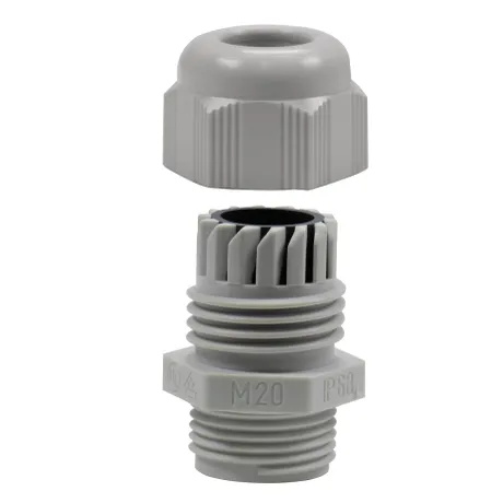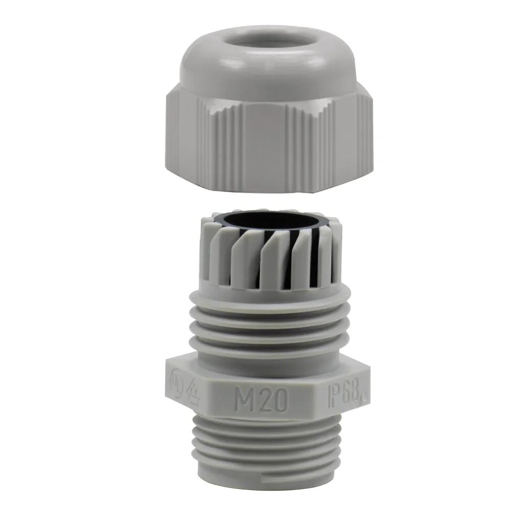 metrisch, Material Polyamid 6 grau mit Neopren-Dichtung, optimale Zugentlastung durch Klemmlamellen, Abdichtung zum Gehäuse durch Dichtungslippe, Trapezgewinde für hohes Anzugsmoment sowie festen und dauerhaften Sitz der Hutmutter, vibrationssicher, gas- und wasserdicht IP68, 5 bar, Temperaturbereich -40°C bis +100°C, VDE