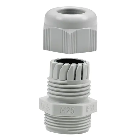 metrisch, Material Polyamid 6 grau mit Neopren-Dichtung, optimale Zugentlastung durch Klemmlamellen, Abdichtung zum Gehäuse durch Dichtungslippe, Trapezgewinde für hohes Anzugsmoment sowie festen und dauerhaften Sitz der Hutmutter, vibrationssicher, gas- und wasserdicht IP68, 5 bar, Temperaturbereich -40°C bis +100°C, VDE
