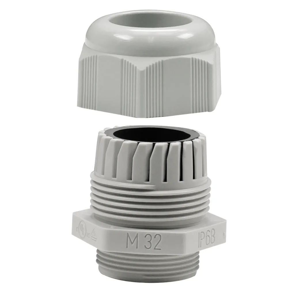 metrisch, Material Polyamid 6 grau mit Neopren-Dichtung, optimale Zugentlastung durch Klemmlamellen, Abdichtung zum Gehäuse durch Dichtungslippe, Trapezgewinde für hohes Anzugsmoment sowie festen und dauerhaften Sitz der Hutmutter, vibrationssicher, gas- und wasserdicht IP68, 5 bar, Temperaturbereich -40°C bis +100°C, VDE