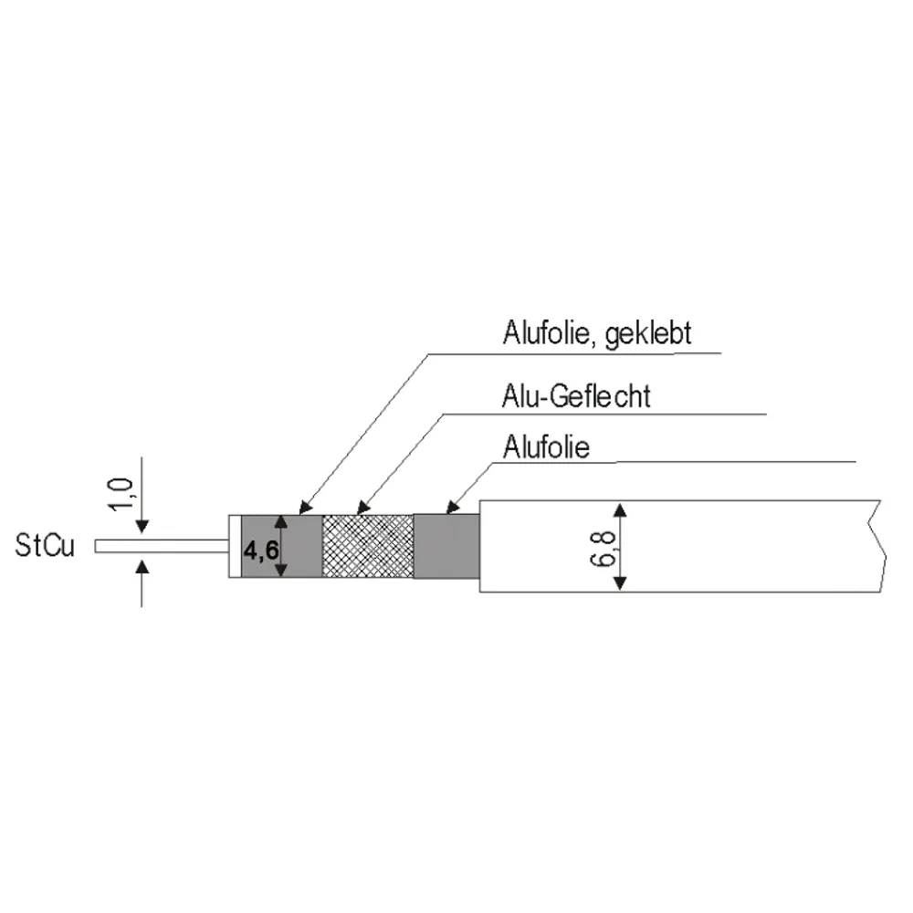 Klasse A (30-3000MHz) - Schirmungsmaß >100dB, gemäß EN 50117-x-ymit Metermarkierung, StCu blank, IL 1,02mm Ø, Dielektrikum 4,6mm Ø, Außen Ø 6,8mm, UV-beständig, Schirmung 3-fach - 2 x Alufolie und Alu-Geflecht