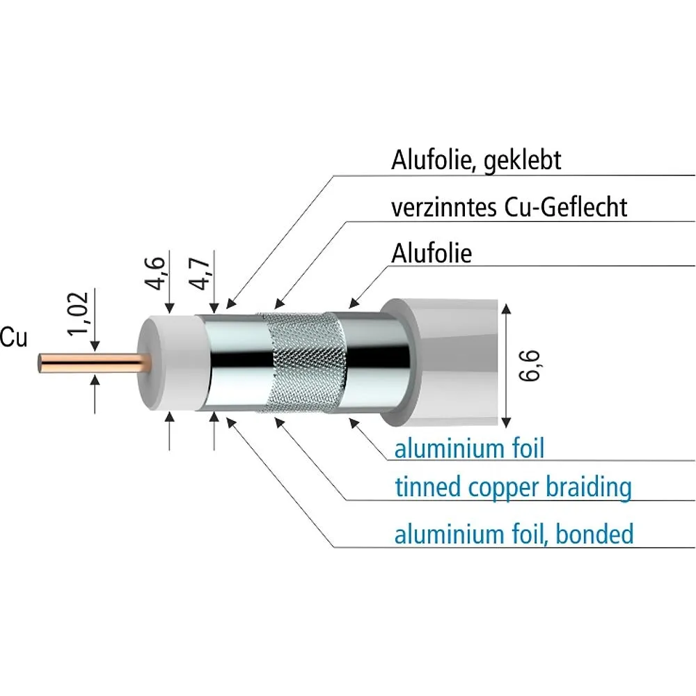 Klasse A+ (30-3000MHz) - Schirmungsmaß >110dB, gemäß KDG 1 TS 153mit degressiver Metermarkierung, Innenleiter Cu blank, IL 1,02mm Ø, Dielektrikum 4,6mm Ø, Außen Ø 6,6mm, UV-beständig, Schirmung 3-fach - 2 x Alufolie und Cu-Geflecht Dämpfungswerte/100m: 30MHz-3,2dB, 200MHz-8,7dB, 400MHz-13,0dB, 800MHz-18,2dB, 1000MHz-20,5dB, 2000MHz-29,9dB, 2400MHz-33,1dB (Preise inklusive Cu-Zuschlag)