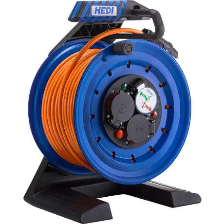 in einer robusten Ausführung mit einem stabilen Tragegestell aus glasfaserverstärktem Kunststoff und einem stabilen Kunststoff-Trommelkörper in blau mit einem Trommeldurchmesser von 250 mm. Die Vollkunststoff-Ausführung verhindert die Gefahr einer Stromübertragung über das Gehäuse und das Trommelgestell. Einige weitere besondere Merkmale dieser Kabeltrommel sind der ergonomisch geformte, isolierte Soft-Touch Tragegriff, der Drehgriff, die drei Trittflächen zum Aufstellen der Füße beim Auf- und Abwickeln der Kabeltrommel, breite Trommelfüße für einen stabilen Stand der Kabeltrommel, der Rotationsstopp-Schalter zur Fixierung des Trommelkörpers, die patentierte 7°-Neigung der Trommel für eine Verlagerung des Trommel-Schwerpunktes sowie die herausnehmbare Kabelhalterung und -führung. Bestückt ist diese Kabeltrommel mit einem HEDI Panzerkabel Plus H07BQ-F 3G1,5 in orange (RAL 2003) mit Schutzkontakt-Stecker, einer spritzwassergeschützten 3-fach Schutzkontakt-Steckdose 250 V, mit Dichtungslippe und selbstschließenden Klappdeckeln, Schutzart IP44, dem HEDI Diagnosesystem DiagS sowie einem Thermoschutzschalter. Für diese Kabeltrommel gewährt HEDI eine Garantie von zwei Jahren. Diese Ausführung ist gemäß den geltenden Normen zugelassen für den ständigen Einsatz im Freien und entspricht den Vorgaben gemäß der DGUV-I 203-005, K2 sowie der DGUV-I 203-006 für den ständigen Einsatz auf Bau- und Montagestellen.