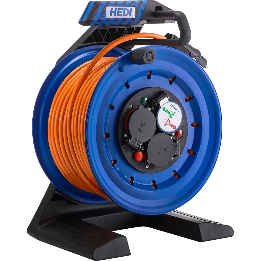 in einer robusten Ausführung mit einem stabilen Tragegestell aus glasfaserverstärktem Kunststoff und einem stabilen Kunststoff-Trommelkörper in blau mit einem Trommeldurchmesser von 250 mm. Die Vollkunststoff-Ausführung verhindert die Gefahr einer Stromübertragung über das Gehäuse und das Trommelgestell. Einige weitere besondere Merkmale dieser Kabeltrommel sind der ergonomisch geformte, isolierte Soft-Touch Tragegriff, der Drehgriff, die drei Trittflächen zum Aufstellen der Füße beim Auf- und Abwickeln der Kabeltrommel, breite Trommelfüße für einen stabilen Stand der Kabeltrommel, der Rotationsstopp-Schalter zur Fixierung des Trommelkörpers, die patentierte 7°-Neigung der Trommel für eine Verlagerung des Trommel-Schwerpunktes sowie die herausnehmbare Kabelhalterung und -führung. Bestückt ist diese Kabeltrommel mit einem HEDI Panzerkabel Plus H07BQ-F 3G1,5 in orange (RAL 2003) mit Schutzkontakt-Stecker, einer spritzwassergeschützten 3-fach Schutzkontakt-Steckdose 250 V, mit Dichtungslippe und selbstschließenden Klappdeckeln, Schutzart IP44, dem HEDI Diagnosesystem DiagS sowie einem Thermoschutzschalter. Für diese Kabeltrommel gewährt HEDI eine Garantie von zwei Jahren. Diese Ausführung ist gemäß den geltenden Normen zugelassen für den ständigen Einsatz im Freien und entspricht den Vorgaben gemäß der DGUV-I 203-005, K2 sowie der DGUV-I 203-006 für den ständigen Einsatz auf Bau- und Montagestellen.