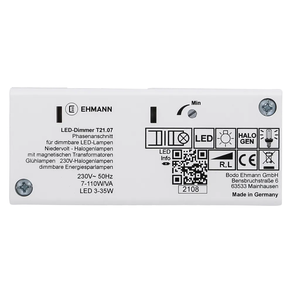 Phasenanschnitt-Dimmer mit Stellwalze zur Helligkeitseinstellung und Schalter Ein/Aus, flackerfreies Dimmen durch einstellbare Minimalhelligkeit, integrierte Feinsicherung 5x20mm/1A, 2 Zugentlastungen für Flachleitung und Rundleitung, L-, N- und PE-Klemme mit Schraubkontakte bis 1,5mm², für Glüh-, HV- und NV-Halogenlampen mit konventionellem Trafo 7-110W/VA und dimmbare LED-Lampen 3-35W, 105x45x25mm