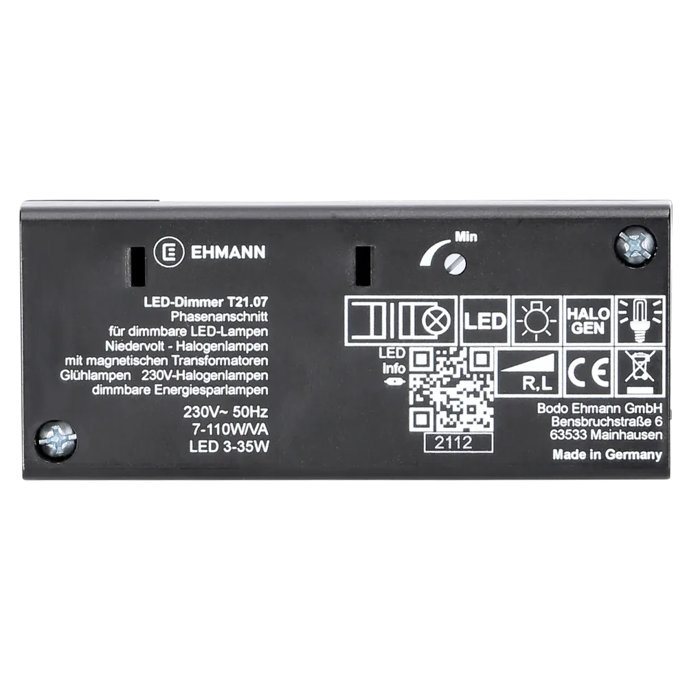 Phasenanschnitt-Dimmer mit Stellwalze zur Helligkeitseinstellung und Schalter Ein/Aus, flackerfreies Dimmen durch einstellbare Minimalhelligkeit, integrierte Feinsicherung 5x20mm/1A, 2 Zugentlastungen für Flachleitung und Rundleitung, L-, N- und PE-Klemme mit Schraubkontakte bis 1,5mm², für Glüh-, HV- und NV-Halogenlampen mit konventionellem Trafo 7-110W/VA und dimmbare LED-Lampen 3-35W, 105x45x25mm