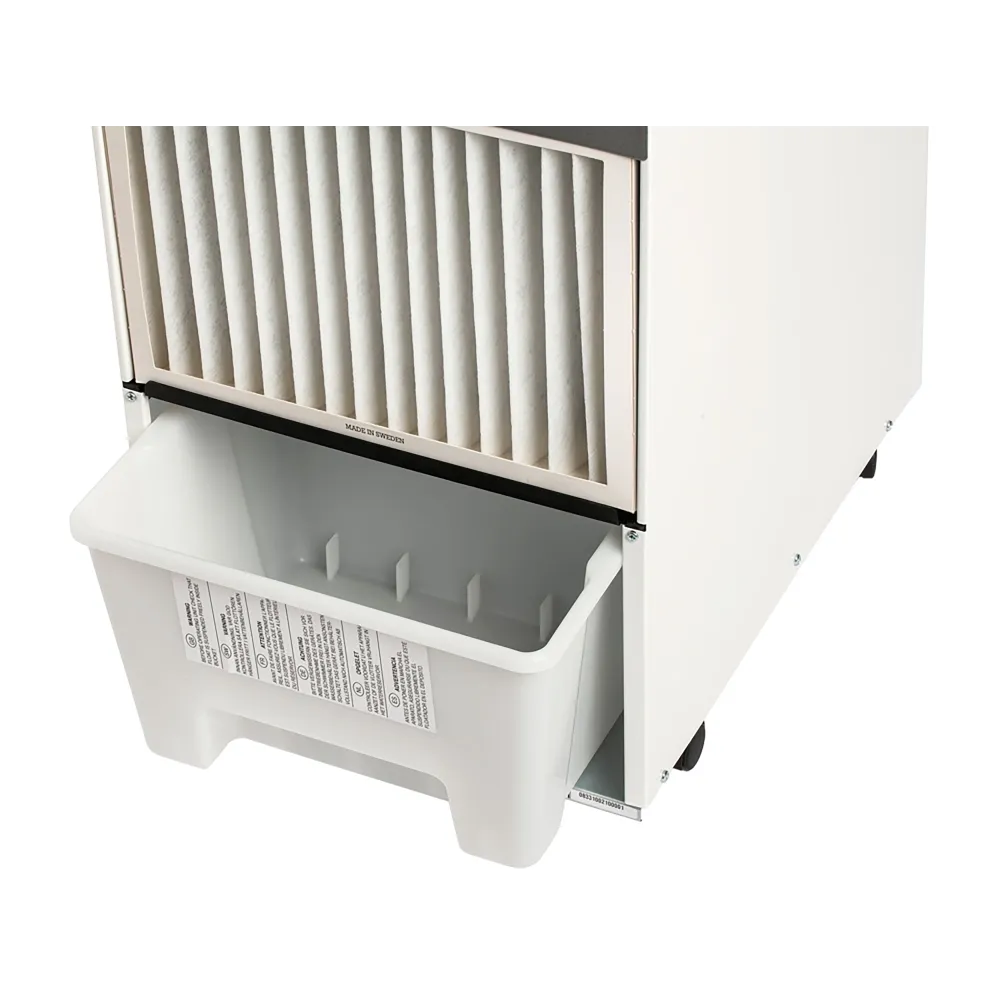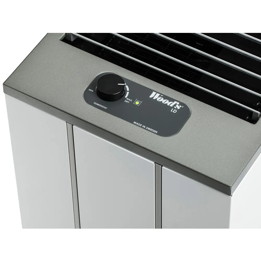 zum schnellen Trocknen von Wäsche und Entfeuchten von großen Räumen bis zu 180 m² , entfernt bis zu 31 Liter Feuchtigkeit pro Tag, bei einem Luftstrom 300 m³/h, inklusive Luftfeuchtigkeitskontrolle bis zu +2°C, 11,4l Wassertank mit ½" ◻ Schlauchanschluss und SMF-Filter, ausgelegt für Dauerbetrieb, Schallpegel 60 dB, Gehäuse Metall, H 640 x B 348 x T 575 mm, IPX1, 10 Jahre Garantie bei Aktivierung