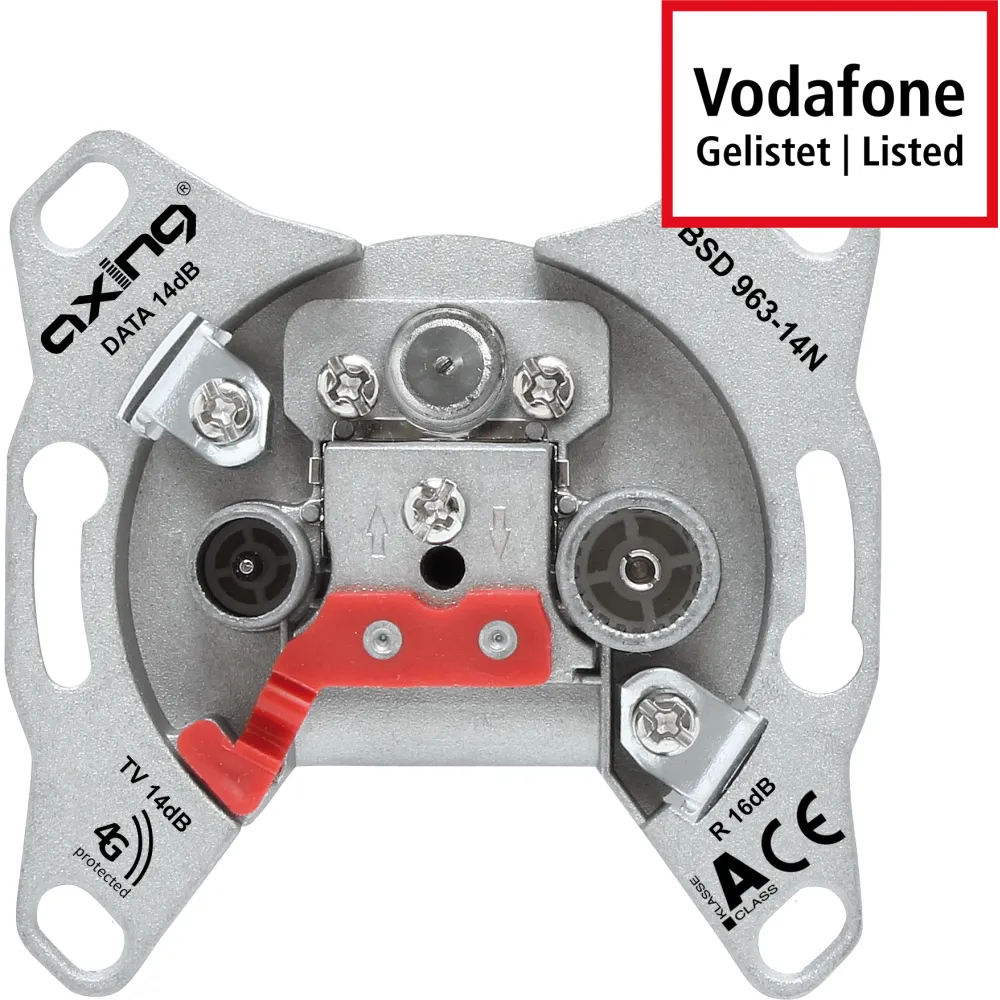 für BK-Kabelnetze mit Internetübertragung, mit 3 Ausgänge, verlängerte F-Buchse, Rückkanal 5-65MHz, breitbandige Auskopplung, 5-1000MHz, Klasse A + 10dB, 4G-protected, HDTV-tauglich, Vodafone Kabel Deutschland gelistet