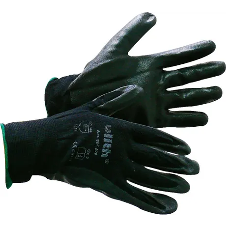 nach EN 388 - Klasse 4121A, Feinstrickträgergewebe mit Nitrilschaum-Beschichtung, teilgetaucht, Handrücken frei, mit Strickbund, CAT 2, hervorragendes Tastgefühl