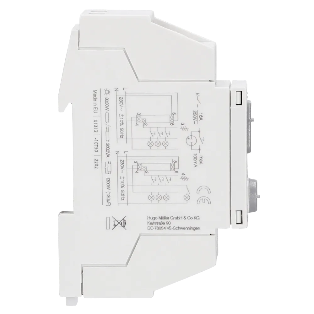 elektronisch mit Ausschaltvorwarnung, 3- und 4-Leiteranschluss, nachschaltbar, Glimmlampenlast bis zu 100 mA, Zeitverzögerung 30 Sek. bis 20 Min., Schaltkontakt 230/16A, Temperaturbereich -10°C bis +50°C, Breite 17,5mm, Höhe 90mm, Tiefe 55mm, IP20