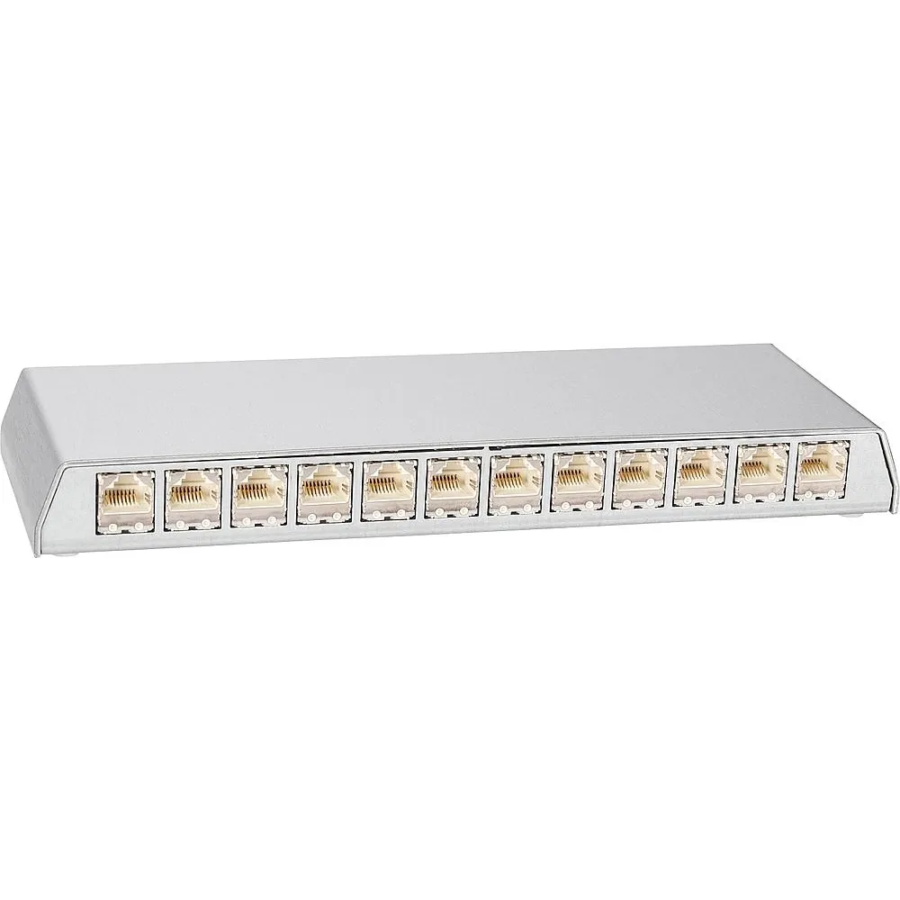 Leergehäuse mit 12 RJ45-Steckbuchsen, für Tisch- und Wandmontage, mit Adapter zur Hutschienenmontage, PoE-fähig, vollgeschirmte Metallausführung mit Rastdeckel und Potentialausgleichset 131x38x110mm