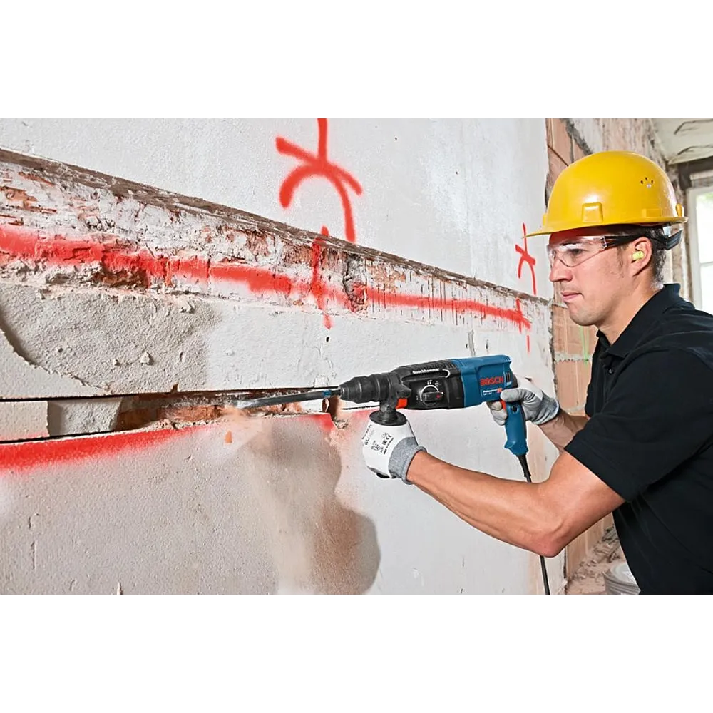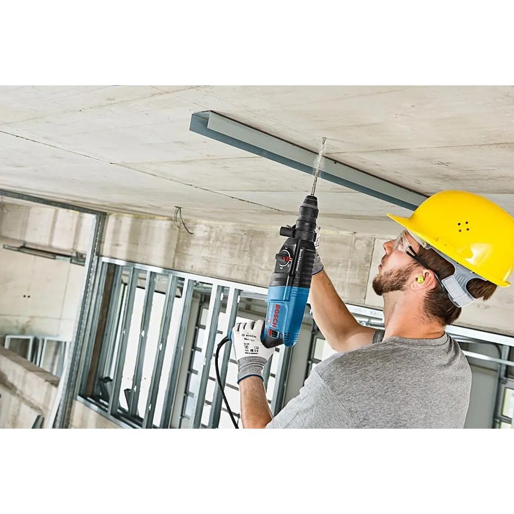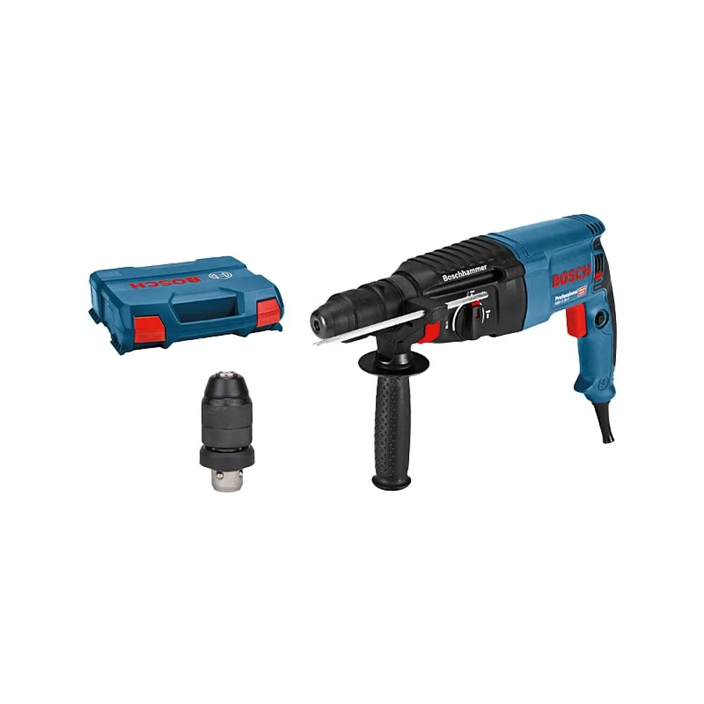 Der GBH 2-26 F Professional mit Schnellspannbohrfutter ist der Allrounder im Bosch SDS plus Segment kabelgebundener Bohrhammer und damit ideal für den täglichen Einsatz. Sein starker Motor liefert eine Schlagenergie von 2,7 Joule und sorgt für schnelles Bohren und eine hohe Meißelabtragsleistung. Aufgrund seiner hochwertigen Bauteile ist er zuverlässig und robust mit langer Lebensdauer. Der optionale Meißelmodus und das Schnellspannbohrfutter ermöglichen den Einsatz bei einer Vielzahl von Anwendungen. Dieses Elektrowerkzeug eignet sich zum Bohren und Meißeln in Beton, Mauerwerk, Holz und Metall. Es ist kompatibel mit verschiedenen Systemzubehören zur Staubabsaugung. Ferner verfügt der GBH 2-26 F Professional über Funktionen wie Rechts-/Links-Lauf, Überlastkupplung, variable Drehzahl und Vario-Lock Lieferung in L-BOXX