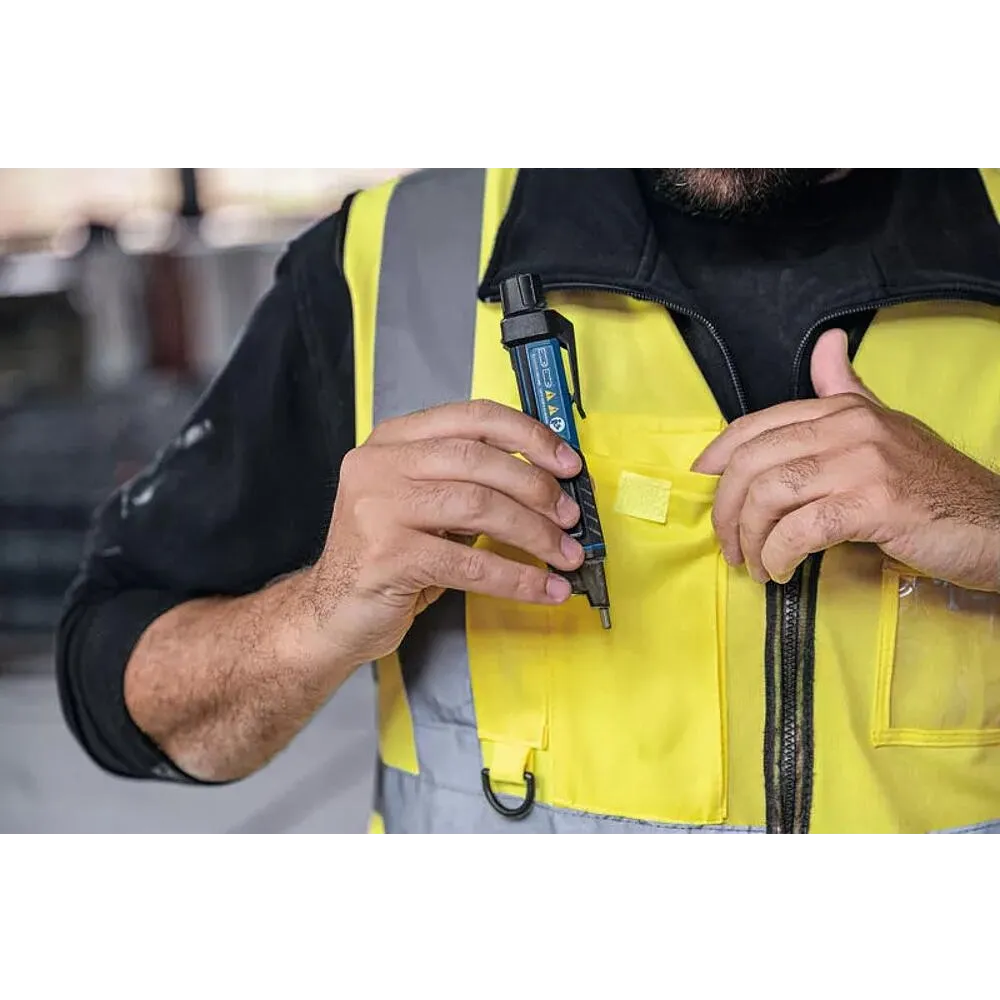 kontaktloser, kapazitiver Spannungstester, erkennt sicher Wechselspannungen ohne Stromfluss, zur Erkennung von spannungsführenden Leitern, Aufspüren von Kabelbrüchen, Erkennen defekter Sicherungen, Überprüfen defekter Schalter, Steckdosen, Anschlussdosen und Aufspüren defekter Lampen in Lichterketten, mit Taschenlampen-Funktion, Rückmeldung akustisch und per Vibration, 162x28x33mm, inklusive Batterien 2x Micro, IP67