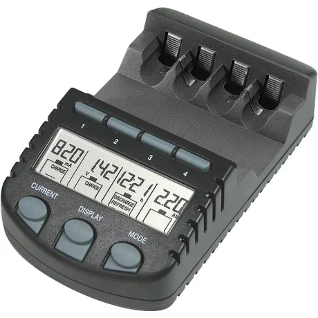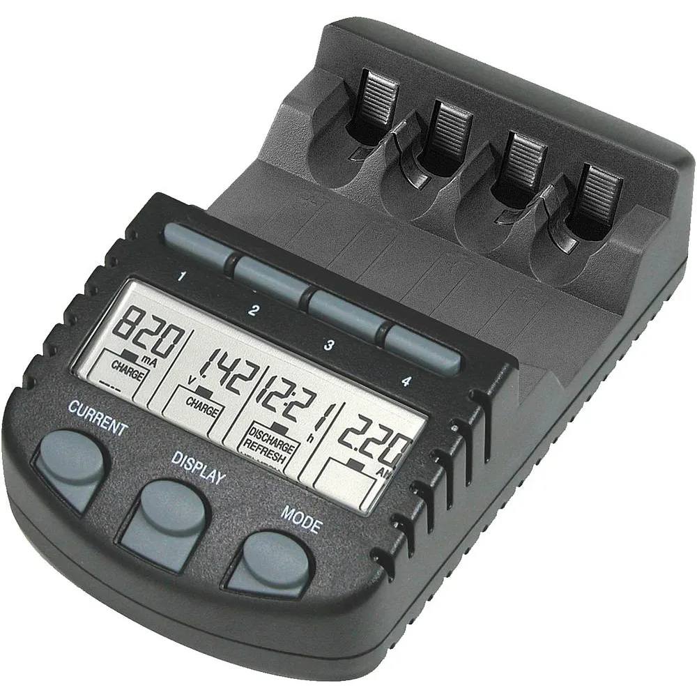 Delta-U-Lader für 1-4 Rundzellen Micro und/oder Mignon, mit Einzelschachtsteuerung, Mikroprozessorsteuerung, separate LCD-Anzeige für jeden Ladeschacht, verschiedene Anzeigemodi während des Ladens/ Entladens: Ladestrom (in mA), abgelaufene Zeit (in hh:mm), Anschlussspannung (in V) und geladene Kapazität (in mAh oder Ah), Entladefunktion, Testfunktion (Kapazitätsprüfung), Refresh- Funktion (Akku-Pflegeprogramm), alle Funktionen gleichzeitig und unabhängig voneinander für jeden Ladeschacht anwendbar, gleichzeitiges Laden/Entladen von AAA Micro und AA Mignon Akkus möglich, Automatische Beendigung des Ladevorgangs zur Vermeidung von Überladung, Akku-Defekt-Erkennung, Überhitzungsschutz für NiCd- / NiMH-Akkus (AAA Micro, AA Mignon), Ladestrombereich (wählbar): 200/ 500/ 700mA, maximale Ladekapazität 3000mAh