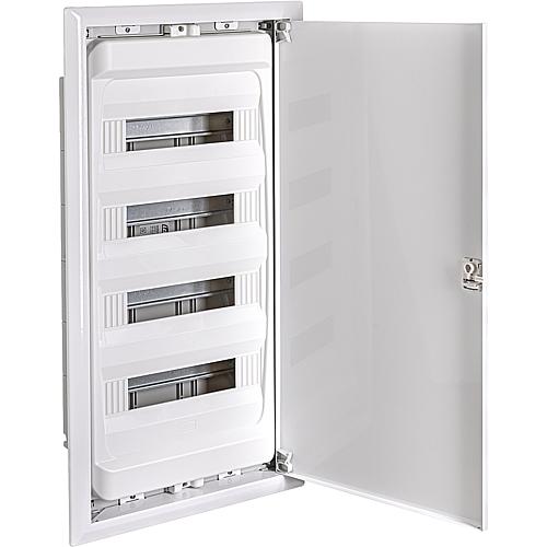 sofort lieferbar Beschreibung Kleinverteiler HW GOLD-M zur Hohlwandmontage, Abdeckung mit Schnellverschluss und selbstschneidenden Schrauben, Reihen aus 14 Modulen, 10 offen und 2+2 vorgestanzt, Tür aus kaltgewalztem Stahlblech, Frontabdeckung aus weißem PS, Elemente aus halogenfreiem Kunststoff, Rahmen und Gehäuse an den vier Ecken plombierbar, vorgestanzte Einlässe für die Einführung von M25-, M32- und M40-Rohren, T-förmige Befestigungsleiste für die Fixierung der Kabel mit Kabelbindern am Gehäuse, PE- und N-Steckklemme, IP40, schlagfest IK08, flammwidrig 650°C, VDE Technische Daten