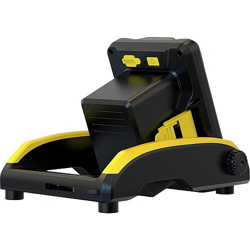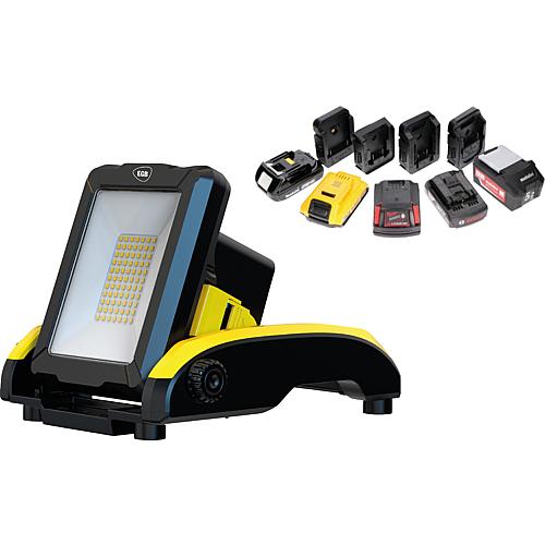 Beschreibung EGB LED-USB-Akku-Strahler IP54 Gehäuse Kunststoff 230x220x270mm, Glas klar, Abstrahlwinkel 100°, 3 Helligkeitsstufen (100% / 50% / 25%), mit Aufhängehaken, vier superstarken Magneten, Strahler stufenlos verstellbar und in jeder Stellung arretierbar, inklusive Adaptern passend für Werkzeugakkus von Milwaukee, Makita, Dewalt, Bosch und CAS (Metabo), USB-Anschluss (5V/1A) zum Aufladen mobiler Endgeräte, Schlagfest (>IK08), IP54 Technische Daten